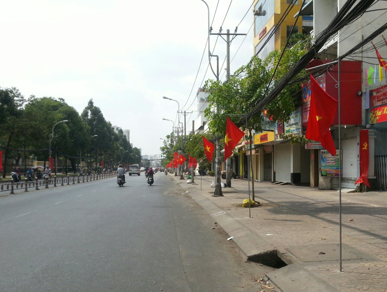 Tết năm nay không thấy bà tổ trưởng nhắc treo cờ, anh công an khu vực đi kiểm tra. Có lẽ mệt mỏi vì nhiều năm nhắc hoài mà dân chúng vẫn lơ là, nên chính quyền địa phương ở nhiều nơi theo lệnh mà xuất tiền trồng cờ dọc theo cầu, dọc theo lề đường. Khắp nơi rực rỡ một màu đỏ như ngày đánh thắng một mùa xuân. Cờ được chất đống trên các xe tải nhỏ và được các bạn trẻ dân phòng vội vã ghé vào, cắm dựng, vuốt… rồi chạy đi chỗ khác làm cho kịp chỉ tiêu. Cờ ngay ngắn và rõ ràng như phân lô đất trong thành phố.