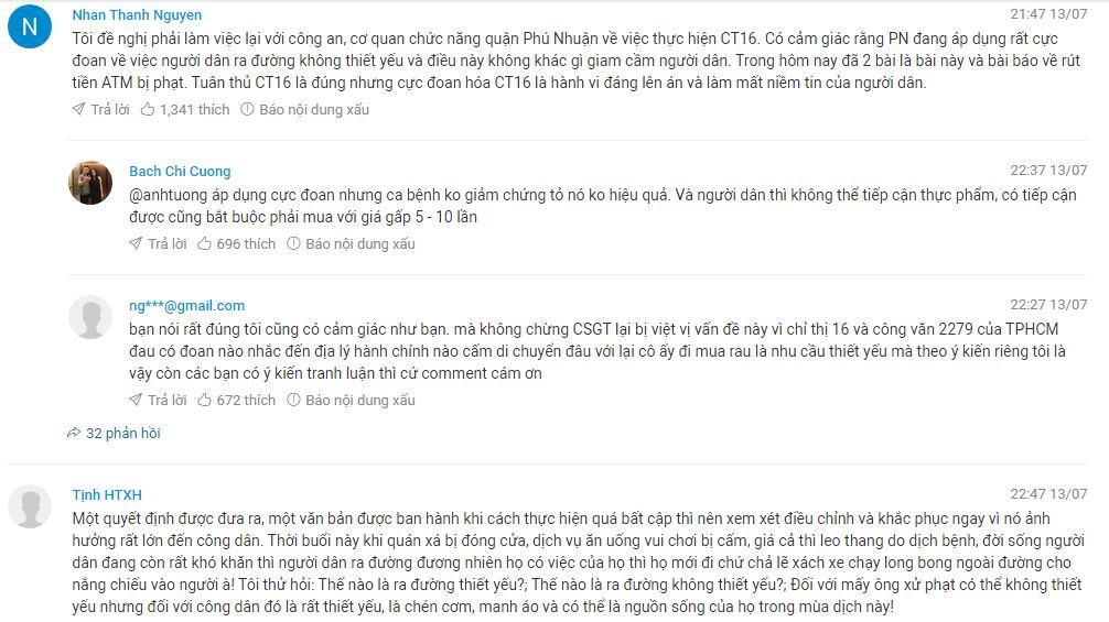 Báo Thanh Niên có bài “Mang rau Đồng Nai lên TP.HCM bị CSGT phạt 2 triệu: Trên đây mắc, sao mua nổi”. Tuy không dám phản ứng với chỉ thị 16, nhưng hàm ý trong bài cũng khó chịu sự cường quyền và lạm dụng phạt người, với hai chủ đề mơ hồ “cần thiết” và “chính đáng” đang được tuyên bố vung vít, thậm chí giảng bài như tuyên giáo ở những chỗ phạt người.